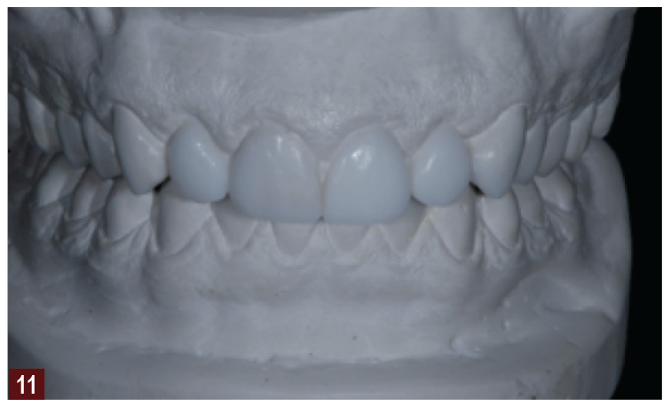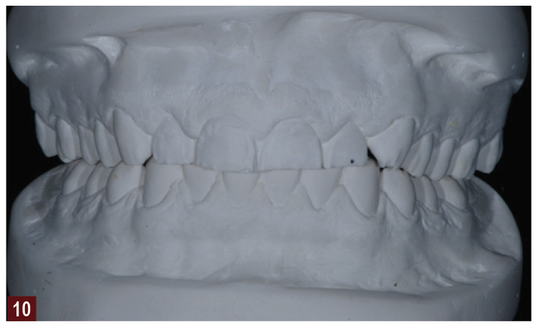 Treating a patient with a worn dentition, as any other condition, uses four steps. We always begin with a thorough examination (Figure 7) and record collection using photographs, models, bite registration, and facebow recording (Figure 8 through Figure 10). This information forms the basis for diagnosing the problems of the patient and allows us to find a stable starting point for our potential solution. The information is also used in our two-dimensional visualization of where the teeth need to reside in the face of the patient to produce optimal function and esthetics, which is the second step. Once the case has been visualized, it can then be converted to three dimensions, using either a traditional diagnostic wax-up (Figure 11) or a virtual wax-up on a computer. Once the design has been decided on, the materials and procedures that are most appropriate can be discussed with the patient. Criteria for the most appropriate treatment approach may be predicated on what existing restorations are present and how much tooth substance remains, and the esthetic requirements as well as the economic situation of the patient.7 Often with worn teeth, the remaining tooth structure is already smaller than the prescribed future tooth shape; therefore the remaining tooth structure can often be increased. This can be described as a solution-driven preparation.