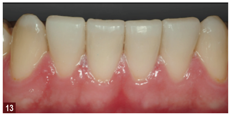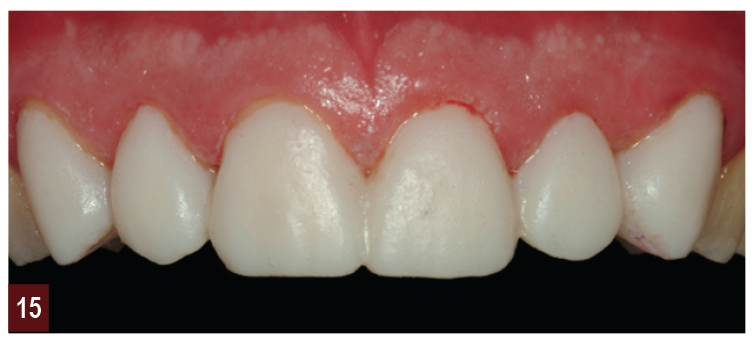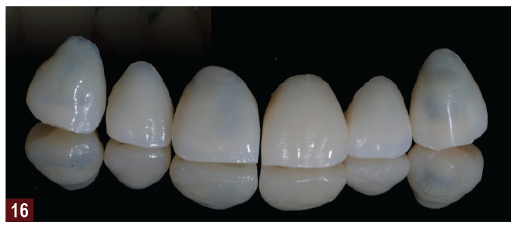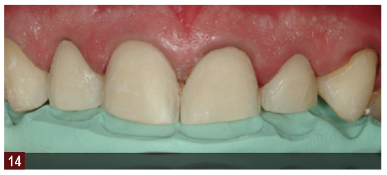 Once we understand where the new tooth needs to reside in space, we often realize that further tooth substance reduction is not necessary. The diagnostic wax-up is used to produce matrices that can be used to make the provisional restorations (Figure 12 through Figure 15), the third step, which in turn drives the position of the final restorations and the position for implant placement or orthodontic movement. Once the provisionals have been approved for esthetics by the patient and the function has been determined by the clinician, then this information can be conveyed to the laboratory so the restorations can be completed. Traditionally, this would be done through photographs, impression of the provisional restorations, bite registration, and facebow registration. Again, now, through the use of digital impressions, there are new and exciting ways of copying the contours and esthetics that we have produced in the provisional restorations. This approach leads to predictable results, as the patient has tried and approved the provisionals before moving to the final restorations, the fourth step (Figure 16 and Figure 17). This makes the whole procedure predictable, efficient, and productive. Considerable evidence in the literature also supports this approach for treatment of the worn dentition.10-13 Muts and colleagues13 described the use of diagnosis waxing and diagnostic tooth arrangements, as well as centric relation for rehabilitation of the worn dentition. They also suggest a provisional stage before the definitive treatment to adjust and improve the design of the definitive restorations, which may be either composite or glass ceramics.