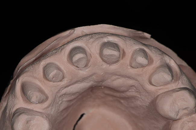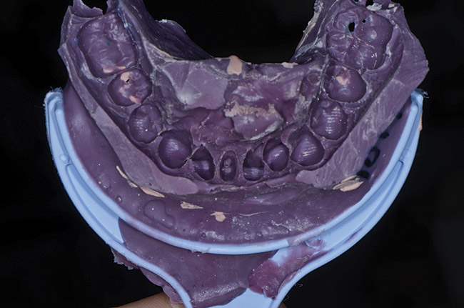 It is important to remember that the purpose of a master impression is to create a master model on which qualified laboratory technicians will fabricate restorations to serve the esthetic, functional, and biologic requirements of the patient. With that in mind, it is critical that upon removal of the impression, it be closely evaluated. The final impression should capture all the surfaces of all the teeth and extend to the mucobuccal fold (Figure 1). If a maxillary impression is made, a good representation of the palate is also important. The occlusal surfaces of all the teeth should be captured in detail (Figure 2). The impression should be free of pulls, voids, and air bubbles (Figure 3). The preparations should be clean, crisp, and free of contamination; in addition, the impression material should have flowed 0.5 mm past the margin circumferentially around the tooth (Figure 4 through Figure 7).