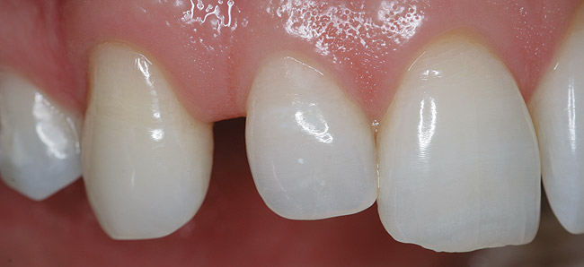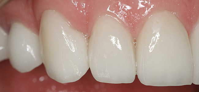 The excessively dark structure of teeth Nos. 8 and 9 also proved to be an esthetic challenge (Figure 28). The preparation designs of the adjacent teeth allowed for conservative reductions of less than 0.5 mm, which would allow natural tooth body shade to reflect light through the restorations. The IPS e.max lithium-disilicate veneers (Ivoclar Vivadent) were placed on teeth Nos. 6, 7, 10, and 11. To cover the darkness of the centrals with an all-ceramic material, the ingots needed to be very opaque. The result would have been an optical value difference in the restorations that was not pleasing. To block the darkness, Captek™ crowns (Captek, www.captek.com) were placed on teeth Nos. 8 and 9.