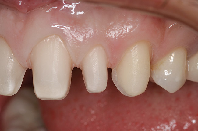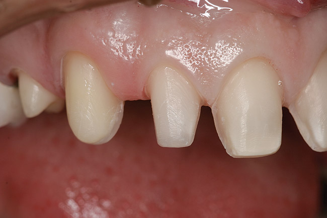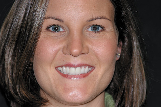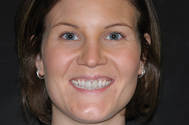 In her late teen years, the patient had undergone orthodontic treatment, which included removal of the maxillary premolars. Teeth Nos. 8 and 9 both had endodontic treatment after a childhood sports accident. This incident left the maxillary central incisors partially ankylosed, which complicated their movement during the orthodontic treatment.
