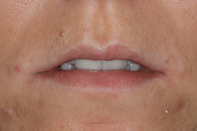 Evaluation of the rest position photograph (Figure 6) clearly showed that too much incisal length was an issue. The long length of the central incisors (more than 14 mm) dominated the smile, accentuating the lack of proportion. It was determined that the current horizontal position of the incisal edges was functionally acceptable.