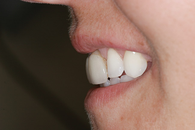 These errors often will be evident from problems associated with restoration failure. The edges will hit first in the patient’s arc of closure. Chipping of porcelain and debonding of the restorations are common. Problems with provisional restorations breaking or coming off can be a warning that contour changes are needed. Issues with provisionals should not be viewed as an aggravation but as a chance to refine positions and correct problems before they become set in porcelain. Dentists are advised to be cautious when patients complain of feeling the teeth are hitting wrong even when it only happens occasionally. The patient’s lower lip may also be overworking to the lingual position in order to interact with the lingualized edges. Difficulty may also be encountered during pronunciation of “S” sounds as teeth nip each other in this malposition.