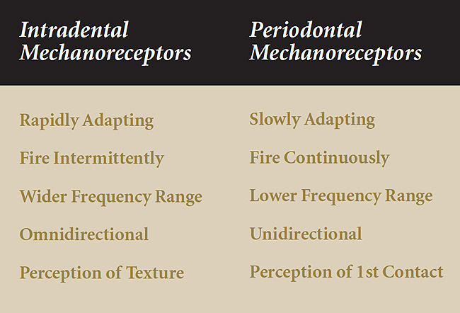 Vibration perception through human skin is essential for accurate perception of textured objects that are grasped.13 Similarly, vibration perception through the teeth enables accurate assessment of textured objects placed in the mouth. The author has developed a test to assess vibration perception thresholds of human teeth. The results show intradental mechanoreceptors encode vibrotactile tooth stimulation at amplitudes low enough to help discern textural differences in objects.14-17 These experiments demonstrate vital maxillary and mandibular incisors encode vibrations between 10 Hertz (Hz) and 315 Hz at low amplitudes and endodontically treated teeth lack the ability to encode vibrations.