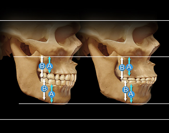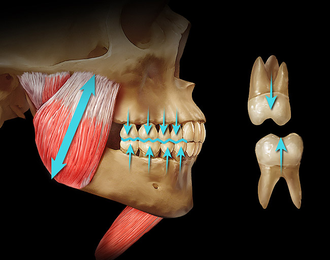 The correct determinant for the mandible-to-maxilla relationship at maximum tooth contact is a result of the repetitive contracted length of the elevator muscles (Figure 2).4 To understand this concept, the dentist must recognize the role balance plays in the eruptive process of the lower teeth toward the erupting upper teeth. Teeth erupt toward their opposing teeth until there is a balance of opposing eruptive forces (Figure 3). The stopping point for eruption occurs as the mandible is positioned vertically in relationship with the maxilla by the repetitious power cycle of the closing musculature. This relationship should be in harmony with the maximum intercuspation of the teeth during complete closure. The key to understanding the vertical dimension of occlusion (VDO) is recognition that the teeth adapt to the vertically positioned mandible as dictated by the musculature, not vice versa. If the repetitive muscle contraction length is impeded, the teeth must adapt to conform to the closing power cycle as muscle regains its optimal contraction length. An adaptive process appears to maintain the VDO throughout life through changes in the dimension of the alveolar processes as needed. Ricketts et al5 showed that lower facial height in adults stayed constant with age. McAndrews6 demonstrated in more than 1,000 orthodontic patients that changes in VDO reverted back to the original dimensions within 1 year, and this occurred whether the VDO was increased or decreased (oral ommunication, 2001).